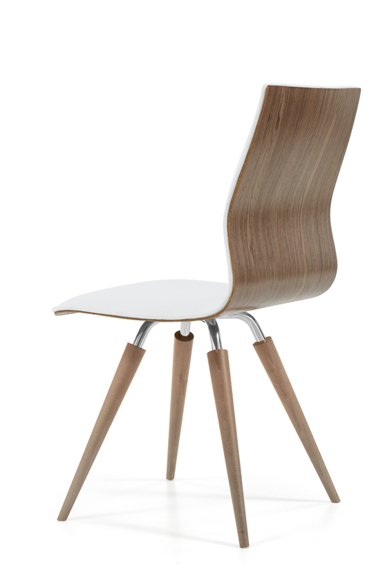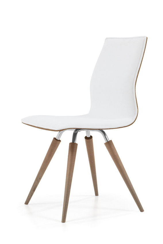 Καρέκλα τραπεζαρίας με inox και ξύλινη βάση, λευκό τεχνόδερμα και ξύλο καρυδιάς στη πλάτη. Μεγάλη ποικιλία σε τεχνοδέρματα, υφασμάτα και αποχρώσεις ξύλου PREVIOUSNEXT