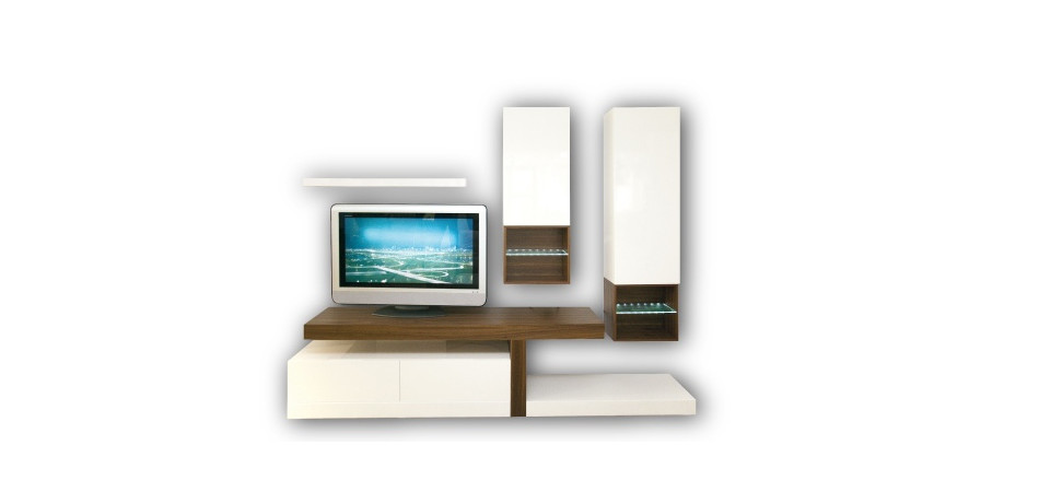 Σύνθεση με συνδυασμό λευκή λάκα με καρυδιά και φωτιζόμενα ραφάκια. 250x45x220cm Διατίθεται σε διαστάσεις και χρώματα της επιλογής σας. PREVIOUSNEXT